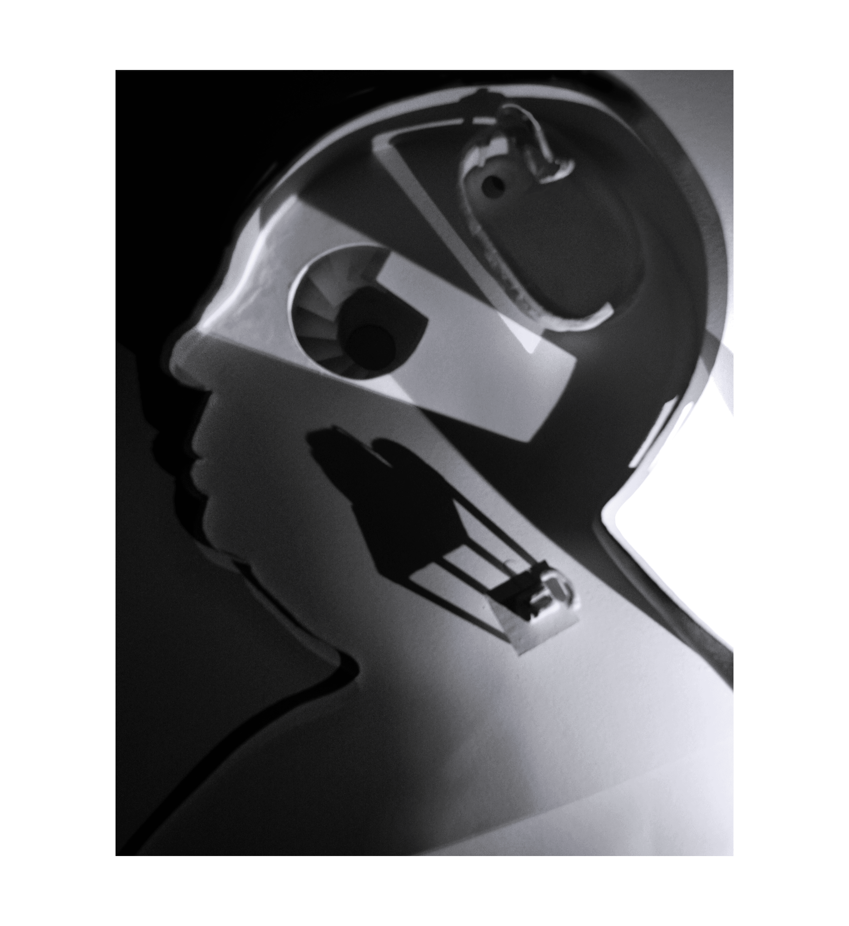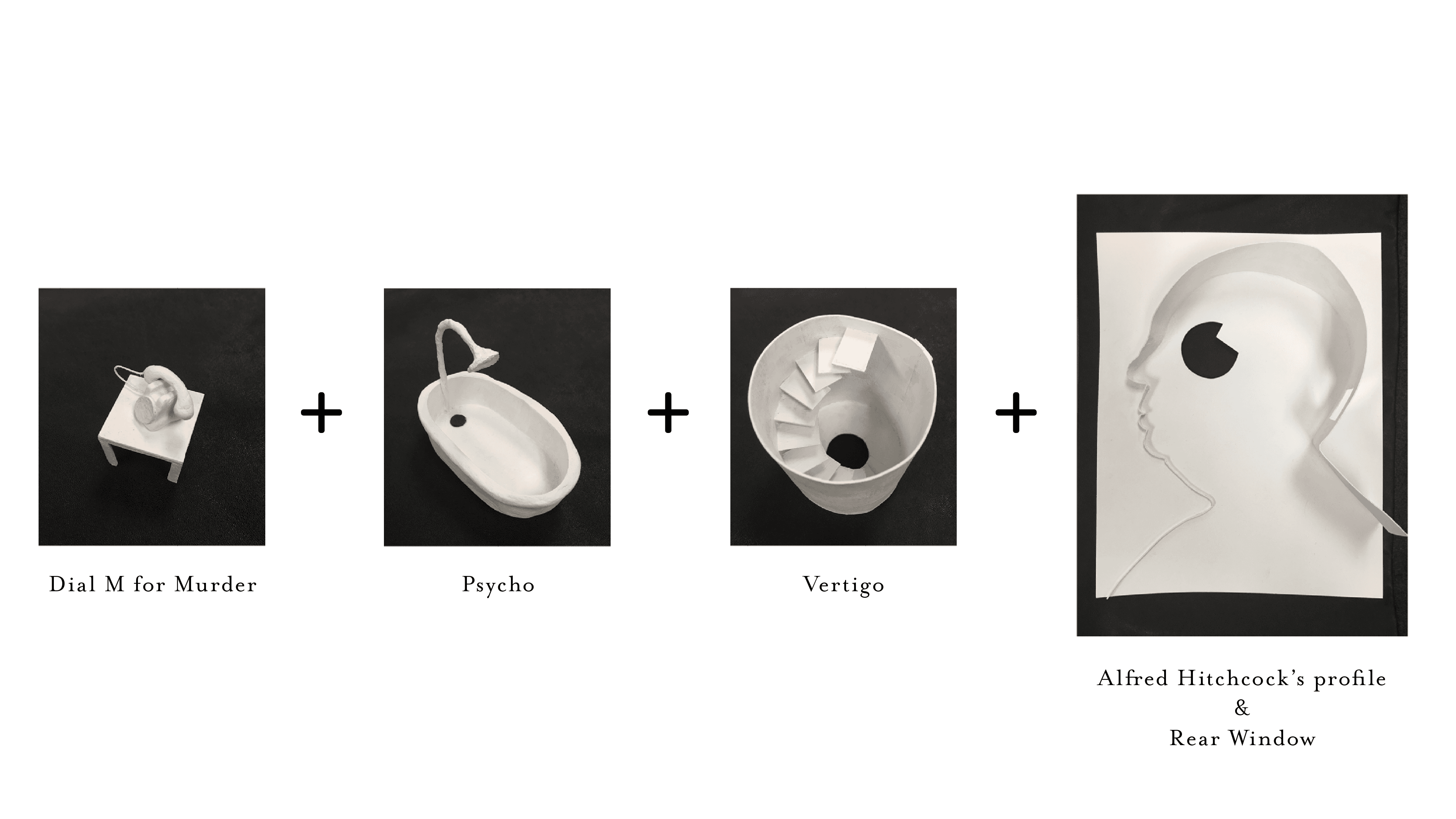 Rather than illustrating scenes directly, I constructed and staged a miniature sculptural set using paper clay and chipboard, entirely in white, to echo Hitchcock’s black-and-white cinematic palette. The set incorporates symbolic props from key films, including a bathtub and showerhead (Psycho), a spiral staircase (Vertigo), a side table with telephone (Dial M for Murder), and architectural cutouts referencing Rear Window. These elements were arranged within a silhouetted profile of Hitchcock’s head, using negative space, windows, and apertures to frame each narrative reference. By lighting the piece from multiple angles with a single flashlight, I captured dramatic shadows that emphasized tension, scale, and anticipation, translating Hitchcock’s cinematic language into a print cover format. The final cover was composited in Photoshop from these photographs, resulting in a proposed book design titled The Art of Alfred Hitchcock: Fifty Years of His Motion Pictures.